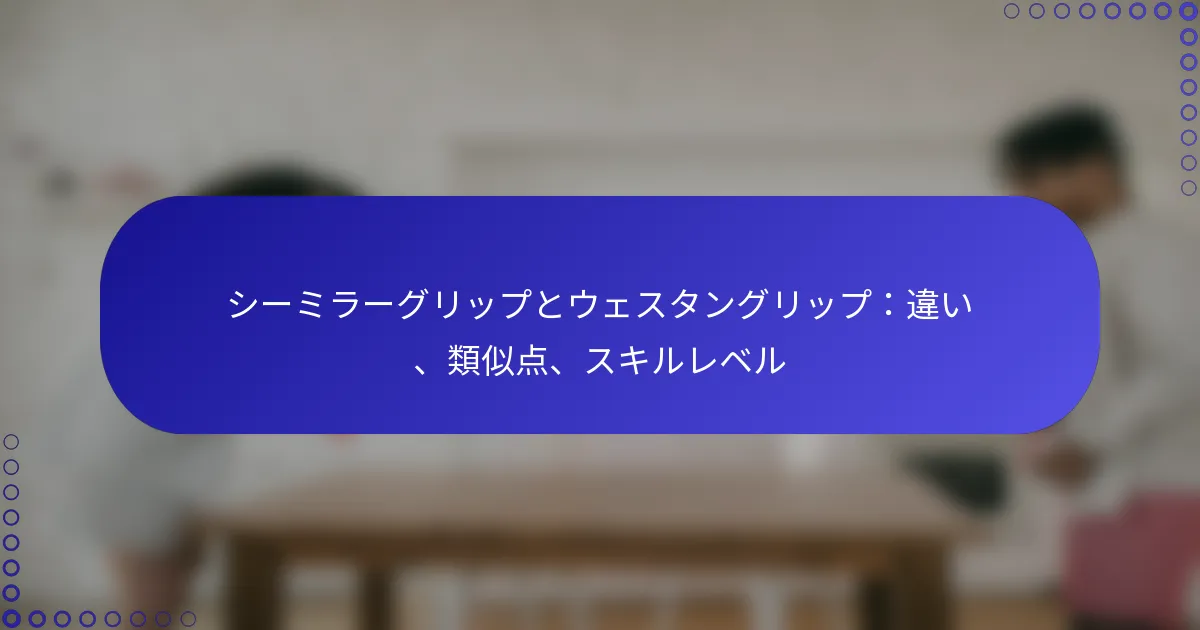 シーミラーグリップとウェスタングリップは、卓球で使用される2つの異なる技術で、それぞれ独自の利点と課題を提供します。どちらのグリップも効果的なプレーを促進しますが、手の位置、グリップの圧力、サポートするストロークの種類において大きく異なります。プレーヤーは、快適さ、適応性、プレースタイルに基づいてこれらのグリップを選ぶことが多く、初心者は通常シーミラーグリップの方が直感的だと感じる一方で、上級者はウェスタングリップの多様性を好むことがあります。 シーミラーグリップとウェスタングリップの主な違いは何ですか? シーミラーグリップとウェスタングリップは、卓球で使用される2つの異なる技術で、それぞれ独自の利点と課題を提供します。どちらのグリップも効果的なプレーを促進しますが、手の位置、グリップの圧力、サポートするストロークの種類において大きく異なります。 シーミラーグリップの手の位置 シーミラーグリップでは、親指と人差し指をラケットの前面に置き、残りの指はハンドルを包み込むようにします。このグリップは、より自然な手首の動きを可能にし、プレー中のスピンとコントロールを向上させます。 シーミラーグリップを使用するプレーヤーは、特にトッピングを生成するのに効果的なフリック動作でフォアハンドとバックハンドのストロークを実行しやすいと感じることが多いです。このグリップの独特な位置付けは、より攻撃的なプレースタイルを促進します。 ウェスタングリップの手の位置 対照的に、ウェスタングリップでは、人差し指がラケットの上端に沿って置かれ、親指が側面からハンドルを支えます。この位置付けは、より安定したグリップを生み出し、強力なストロークとボールの配置に対するより良いコントロールを可能にします。 ウェスタングリップを採用するプレーヤーは、グリップがフルスイングの動作を促進するため、強力なフォアハンドドライブの恩恵を受けることが多いです。しかし、このグリップは、効果的なバックハンドストロークを実行するために、より多くの手首の柔軟性を必要とする場合があります。 グリップ圧力の変動 シーミラーグリップのグリップ圧力は軽めで、素早い調整と流れるような動きを可能にします。この軽いグリップはスピン生成を向上させることができますが、強力なショットの際には安定性が欠ける可能性があります。 逆に、ウェスタングリップを使用するプレーヤーは、より多くの圧力をかけることが多く、攻撃的なプレー中にコントロールを維持するのに役立ちます。このしっかりとしたグリップは、一貫したショットの配置をもたらすことができますが、速いラリーでの素早い調整を制限する場合があります。 シーミラーグリップで実行できるストロークの種類 シーミラーグリップは、トッピングストロークや素早いフリックを実行するのに特に効果的で、攻撃的なプレーヤーに最適です。そのデザインは、迅速な手首の動きを可能にし、プレーヤーがボールに大きなスピンを生成できるようにします。 さらに、このグリップは効果的なカウンターヒットをサポートし、プレーヤーが相手のショットに迅速に反応できるようにします。ただし、他のグリップに比べてフラットで強力なストロークを実行するのには効果が薄い場合があります。 ウェスタングリップで実行できるストロークの種類 ウェスタングリップは、強力なフォアハンドドライブやフラットヒットを生み出すのに優れており、攻撃的なプレーヤーに好まれる選択肢です。このグリップの安定性は、フルスイングをサポートし、最大のパワーと精度を可能にします。 シーミラーグリップほどスピンを生成しないかもしれませんが、ウェスタングリップはコントロールされたバックハンドストロークを実行するのに効果的です。プレーヤーは、パワーと配置のバランスの取れた組み合わせを達成できるため、さまざまなプレースタイルに対応できます。 シーミラーグリップとウェスタングリップの共通点は何ですか? シーミラーグリップとウェスタングリップは、卓球プレーヤーの間で人気があり、独自の利点を提供しながらいくつかの特徴を共有しています。プレーヤーは、快適さ、適応性、プレースタイルに基づいてこれらのグリップを選ぶことが多いです。